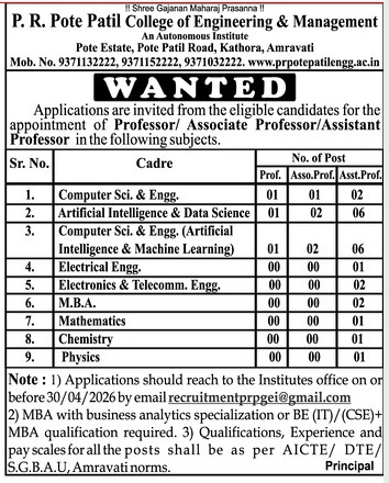 P.R Pote Patil College of Engineering & Management, Amravati has announced a job notification for the academic year 2026–2027. The institution invites applications from qualified and experienced candidates for Professor, Associate Professor, and Assistant Professor positions in various engineering disciplines. Candidates with Good Academic Record are eligible to apply. Interested candidates can apply via Email by submitting required documents before the deadline.