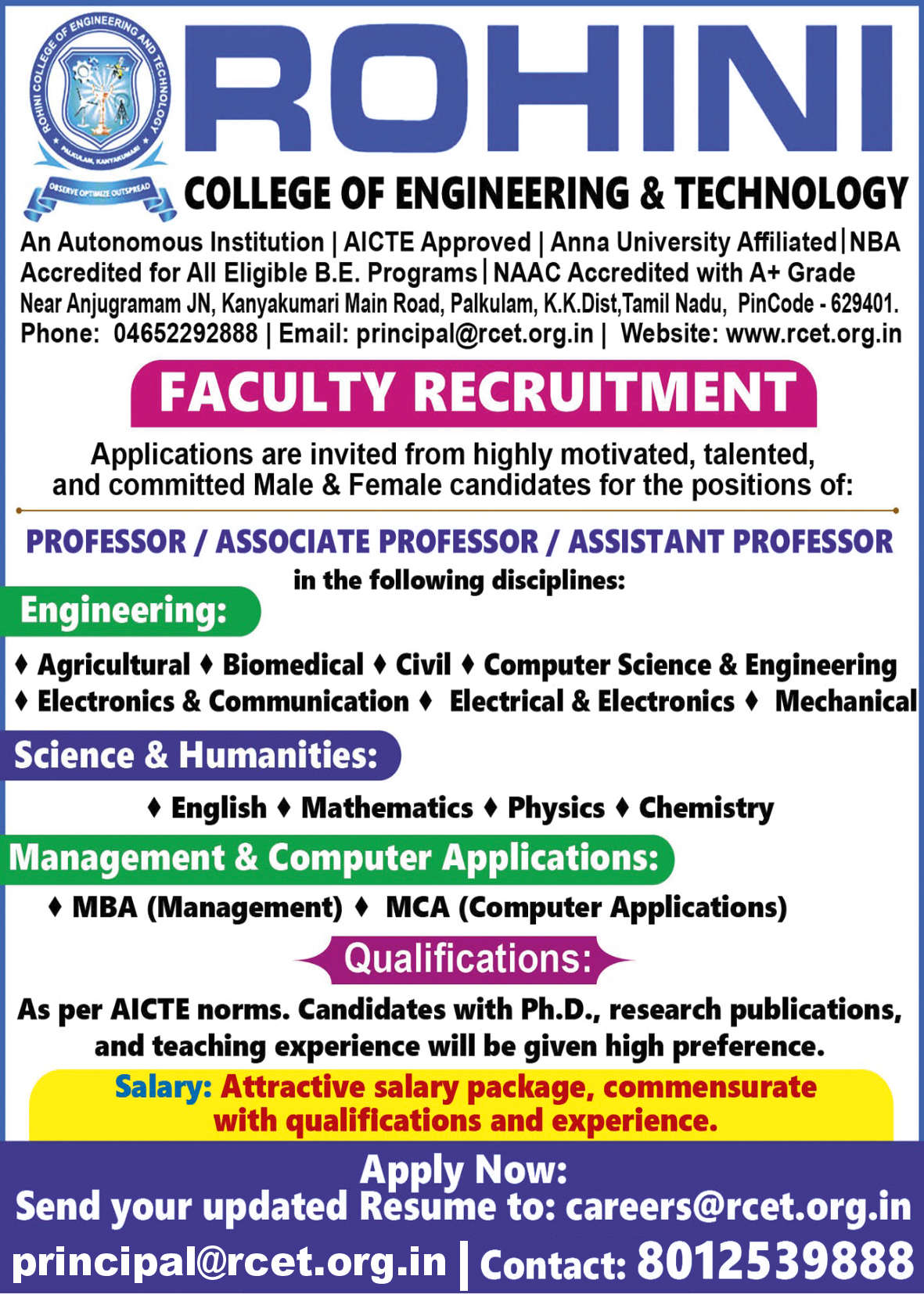 Rohini College of Engineering and Technology, Palkulam, Tamilnadu wanted Assistant Professor/ Associate Professor/ Professor for Various Department. Candidates with AICTE Norms are eligible to apply. Interested candidates can apply via email by submitting required documents before the deadline.