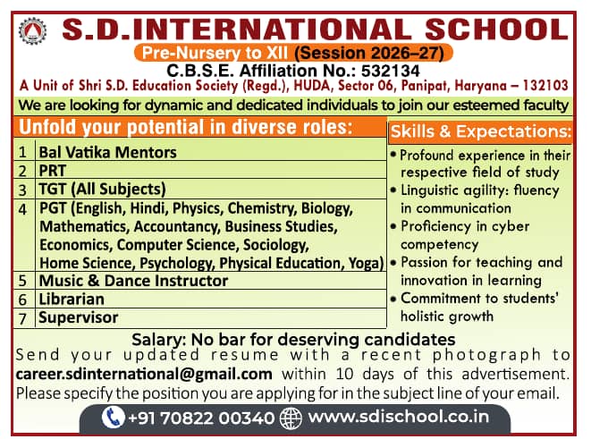 - PGT -English, Hindi, Physics, Chemistry, Biology, Mathematics, Accountancy, Business Studies, Economics, Computer Science, Sociology, Home Science, Psychology, Physical Education, Yoga