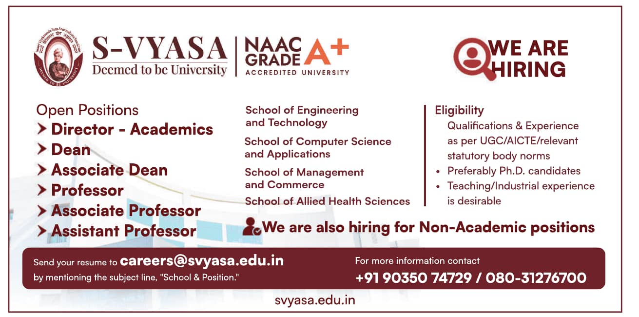 S-VYASA University (Deemed-to-be University), Bengaluru Wanted Faculty