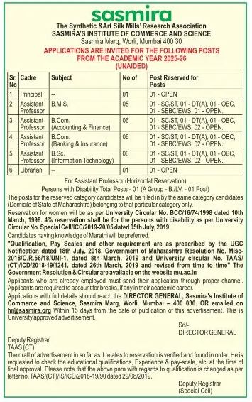 Sasmira’s Institute of Commerce and Science, Mumbai Wanted Principal, Assistant Professor and Librarian for Various Department . Candidates with Good Academic Record are eligible to apply. Interested candidates can apply via Postal/ Email by submitting required documents before the deadline.