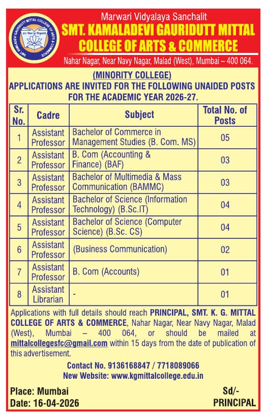 Smt. Kamaldevi Gauridutt Mittal College of Arts & Commerce, Mumbai has announced a job notification for the academic year 2026–2027. The institution invites applications from qualified and experienced candidates for Assistant Professor positions for Various Disciplines. Candidates with Good Academic Record are eligible to apply. Interested candidates can apply Email and Postal by submitting required documents before the deadline.