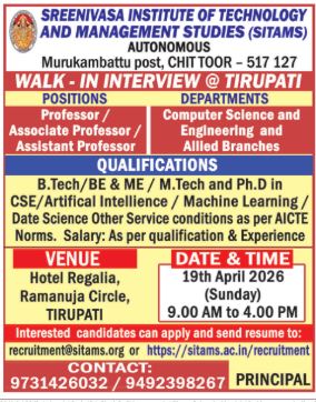 Sreenivasa Institute of Technology and Management Studies, Chittoor Wanted Professor/ Associate Professor/ Assistant Professor for Various Department . Candidates with Good Academic Record are eligible to apply. Interested candidates can apply via Email/ Online by submitting required documents before the deadline.