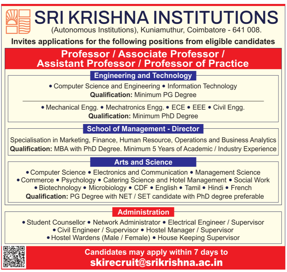 Email Address to Apply: skirecruit@srikrishna.ac.in