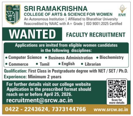 Sri Ramakrishna College of Arts and Science for Women, Coimbatore Wanted Teaching Faculty