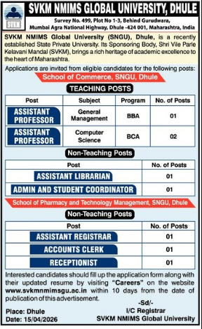 SVKM NMIMS Global University, Dhule Wanted Teaching and Non-Teaching Faculty for Various Department . Candidates with Good Academic Record are eligible to apply. Interested candidates can apply via Online by submitting required documents before the deadline.
