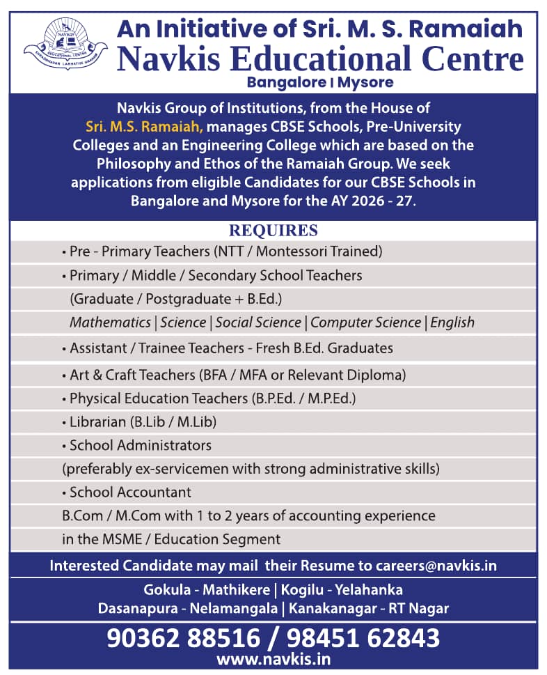 Navkis Educational Centre, an initiative of Sri M.S. Ramaiah Group, has announced recruitment for teaching and non-teaching positions for the academic year 2026–2027. Applications are invited for Pre-Primary, Primary, Middle, Secondary Teachers, and various administrative roles across their CBSE schools in Bangalore and Mysore. The institution is seeking passionate educators and skilled professionals committed to academic excellence. This is a great opportunity for candidates looking for CBSE school jobs in Karnataka. Interested applicants should apply through email at the earliest.