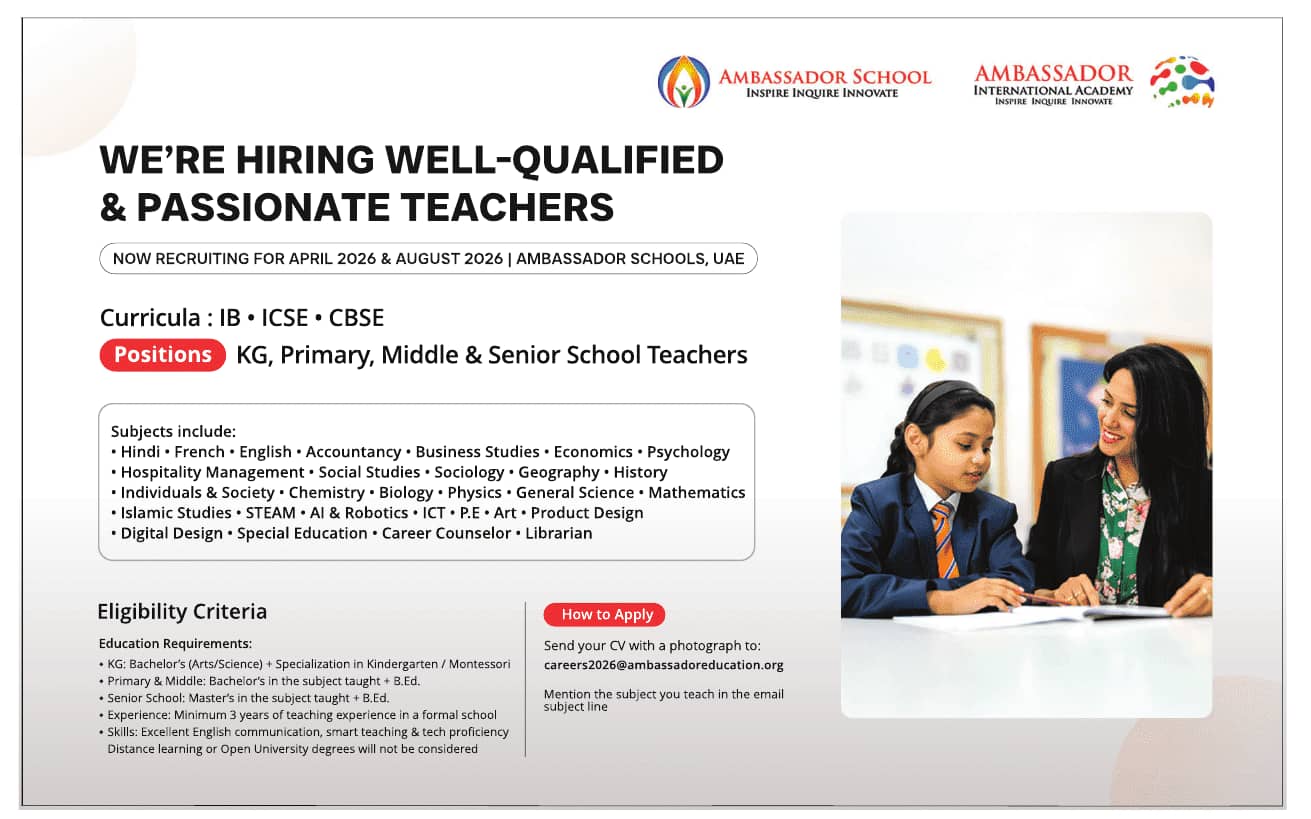 Teaching Faculty jobs recruitment in Ambassador Schools, Dubai, UAE for the post of KG/Primary/Middle/ Senior School Teachers for the 2025-2026 academic year. Eligible candidates may apply through email immediately.