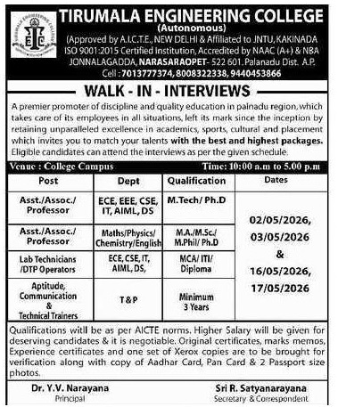 Tirumala Engineering College , Andhra Pradesh has announced a job notification for the academic year 2026–2027. The institution invites applications from qualified and experienced candidates for Professor, Associate Professor, and Assistant Professor positions in various disciplines. Candidates with Good Academic Record are eligible to apply. Interested candidates can attend the Walk-In Interview