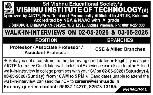 Vishnu Institute of Technology, Bhimavaram has announced a job notification for the academic year 2026–2027. The institution invites applications from qualified and experienced candidates for Professor, Associate Professor, and Assistant Professor positions in various disciplines. Candidates with Good Academic Record are eligible to apply. Interested candidates can attend the Walk-In Interview